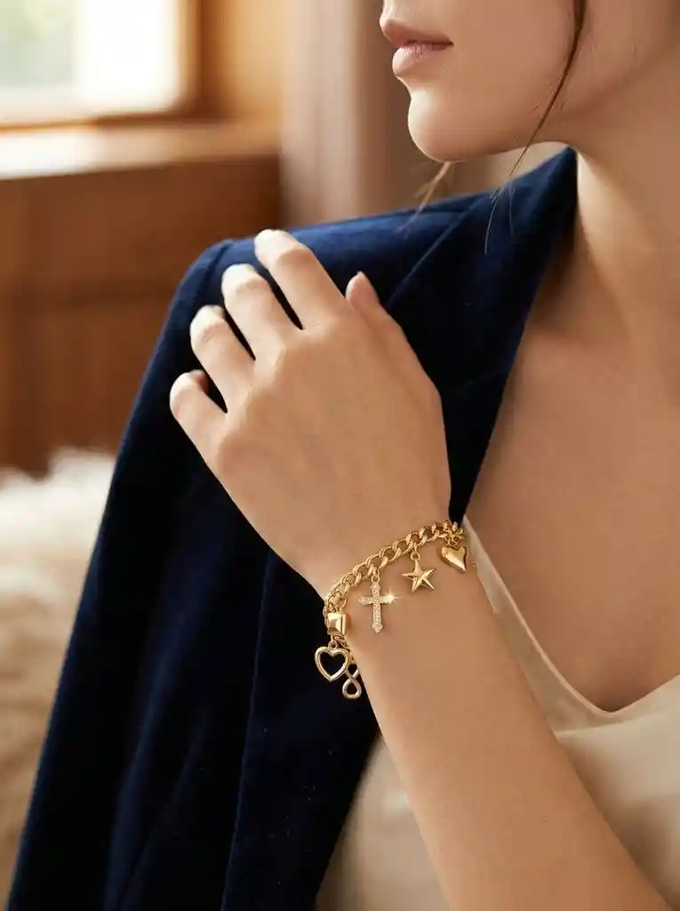 La “Pulsera Destellos de Esperanza” es una pieza encantadora que reúne delicados dijes colgantes: infinito, estrella, corazón, cruz y rombo, creando un diseño armonioso y lleno de significado. Cada detalle aporta movimiento y brillo, representando amor eterno, fe, guía y propósito en cada etapa de la vida. “Porque yo sé los planes que tengo para ustedes —declara el Señor— planes de bienestar y no de calamidad, para darles un futuro y una esperanza.” — Jeremías 29:11 Una pulsera que recuerda que tu historia está en manos de Dios y que su plan para ti siempre está lleno de esperanza y un futuro bendecido. ✨