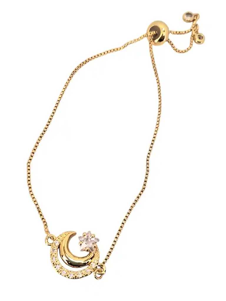 Añade un toque celestial a tu estilo con esta elegante pulsera de acero dorada. El diseño presenta un delicado colgante en forma de media luna adornado con pequeños cristales brillantes que capturan la luz de manera sutil pero cautivadora. Justo en el centro de la luna, se encuentra una estrella resplandeciente que aporta un toque de magia a la pieza. Hecha con materiales de alta calidad, esta pulsera es ideal para cualquier ocasión, ya sea una salida casual o un evento especial. Su cadena fina ajustable garantiza un ajuste cómodo y seguro en cualquier tamaño de muñeca. Perfecta como regalo o para consentirte, esta pulsera combina lo moderno con lo místico, y es el accesorio ideal para cualquier amante de las estrellas. Características: Material: Acero Colgante: Luna con incrustaciones de cristales y estrella Ajustable para diferentes tamaños de muñeca Cierre: Broche tipo mosquetón