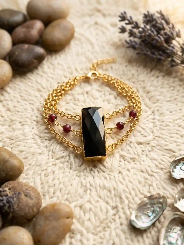 Sofisticada y llena de carácter, esta pulsera combina la delicadeza de sus finas cadenas en bronce con baño en oro con la fuerza y profundidad de su piedra central en tono oscuro, creando un equilibrio perfecto entre elegancia y energía. El diseño de doble cadena se complementa con pequeñas piedras naturales en tonos rosados, que aportan un toque sutil de color, amor y armonía. Su pieza central, de corte rectangular, resalta por su brillo y presencia, convirtiéndola en un accesorio único y atemporal. ✨ Detalles: Material: Bronce con baño en oro Piedra central de corte rectangular Detalles con piedras naturales en tonos vino tinto Diseño delicado de múltiples cadenas Cierre seguro y ajustable Cada pulsera integra diferentes elementos y materiales que merecen un cuidado especial. - Al ser una pieza ensamblada de forma artesanal el producto entregado puede presentar diferencias de colores y acabados al expuesto en la fotografía