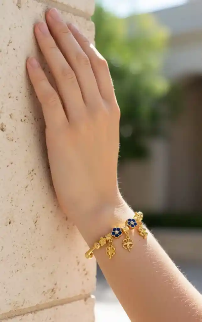 Pulsera entorchada con dijes dorada con trebol y flores azul