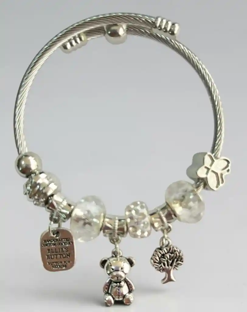 Pulsera entorchada con dijes plateada con osito y Charms transparente