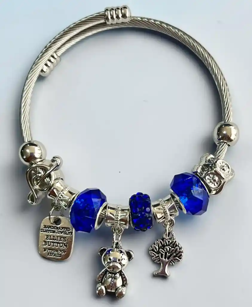 Pulsera entorchada con dijes plateada con osito y Charms azul rey