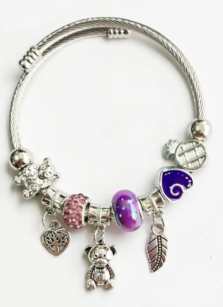 Pulsera entorchada con dijes plateada con osito y Charms morado