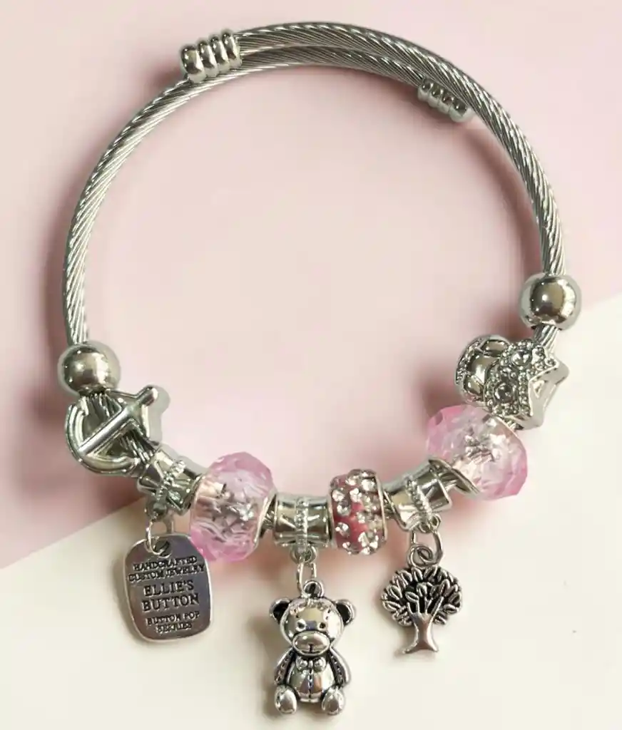 Pulsera entorchada con dijes plateada con osito y Charms rosada