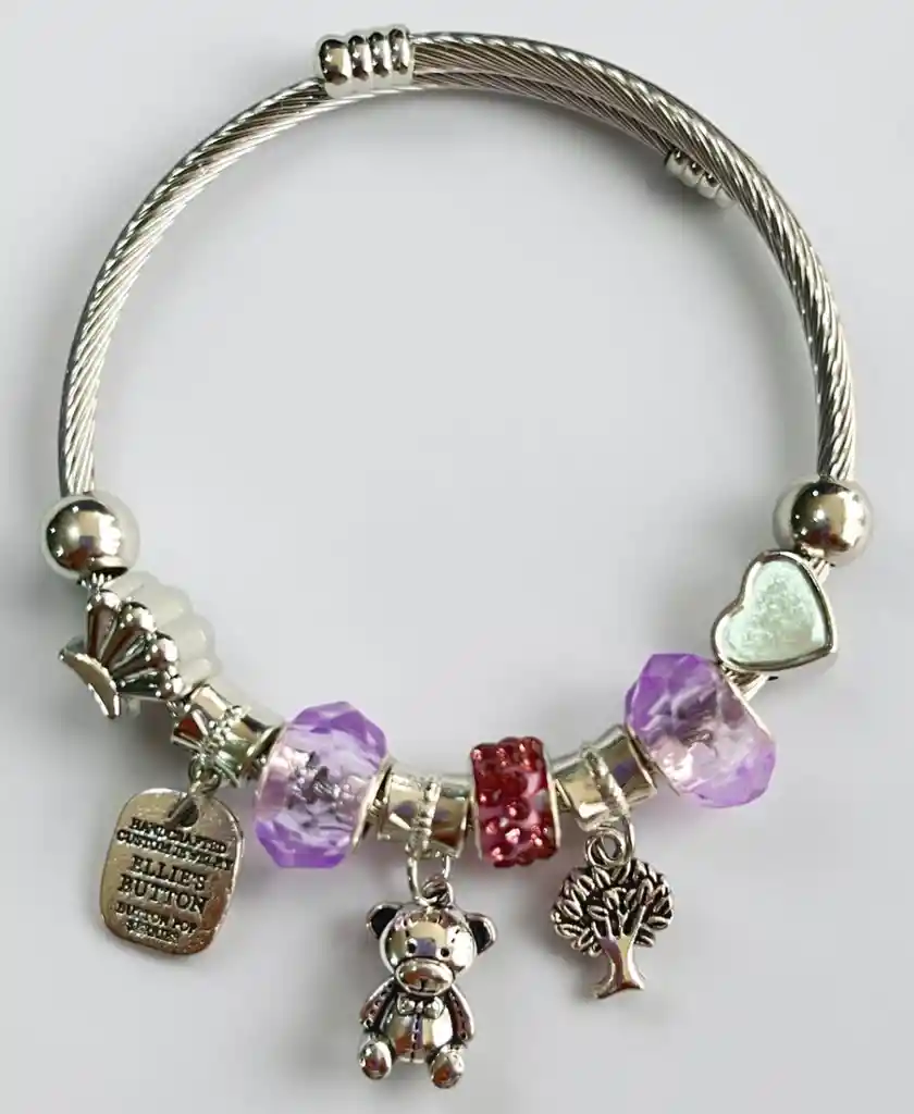 Pulsera entorchada con dijes plateada con osito y Charms lila