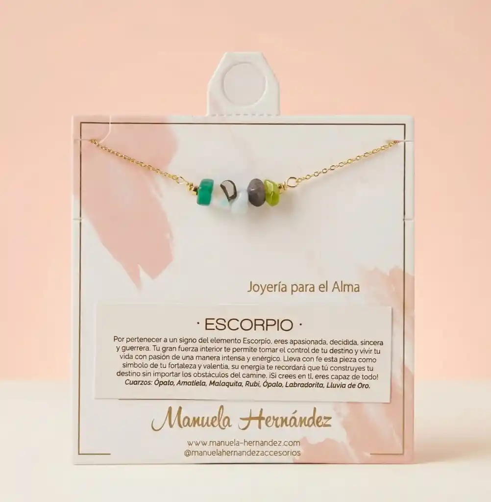 La cadena y los apliques dorados cuentan con Baño de Oro 18k. Elaborado con Cuarzos Naturales.