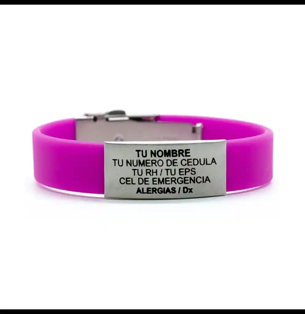 Pulsera de identificacion personal personalizada con datos personales de emergencia : Personálizala con NOMBRE, CEDULA , RH, EPS, CONTACTOS DE EMERGENCIA, ENFERMEDADES O ALERGIAS Esta pulsera es Salva vidas , es ajustable a la mano la puedes cortar a tu medida y con broche de seguridad. la pulsera es de 1 cm de ancho y de largo tiene 21 cm