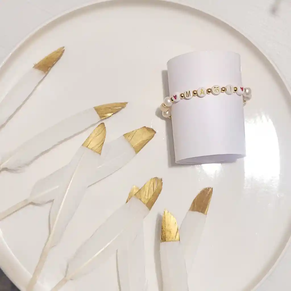 Elaborada con perlas naturales, herrajes en oro golfield y palabra MAMI con letras doradas