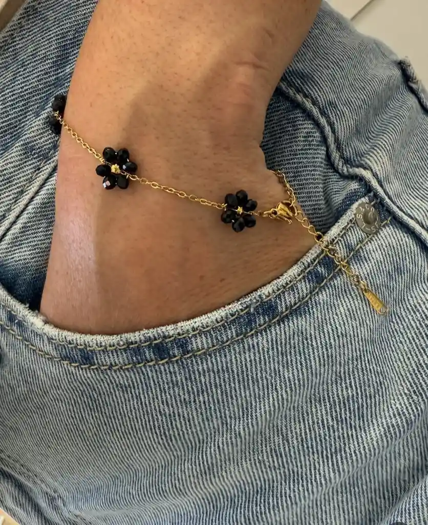 Pulsera con flores negras tejidas en cristal Murano y cadena dorada. Delicada, ligera y ajustable, ideal para darle un toque especial a tu look. Su diseño femenino y moderno la hace ideal para usar todos los días o en ocasiones especiales.