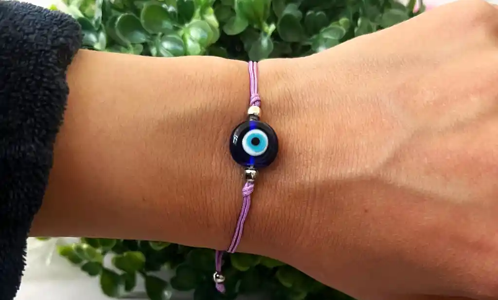 PULSERA DE HILO LILA CON DIJE DE OJO AZUL