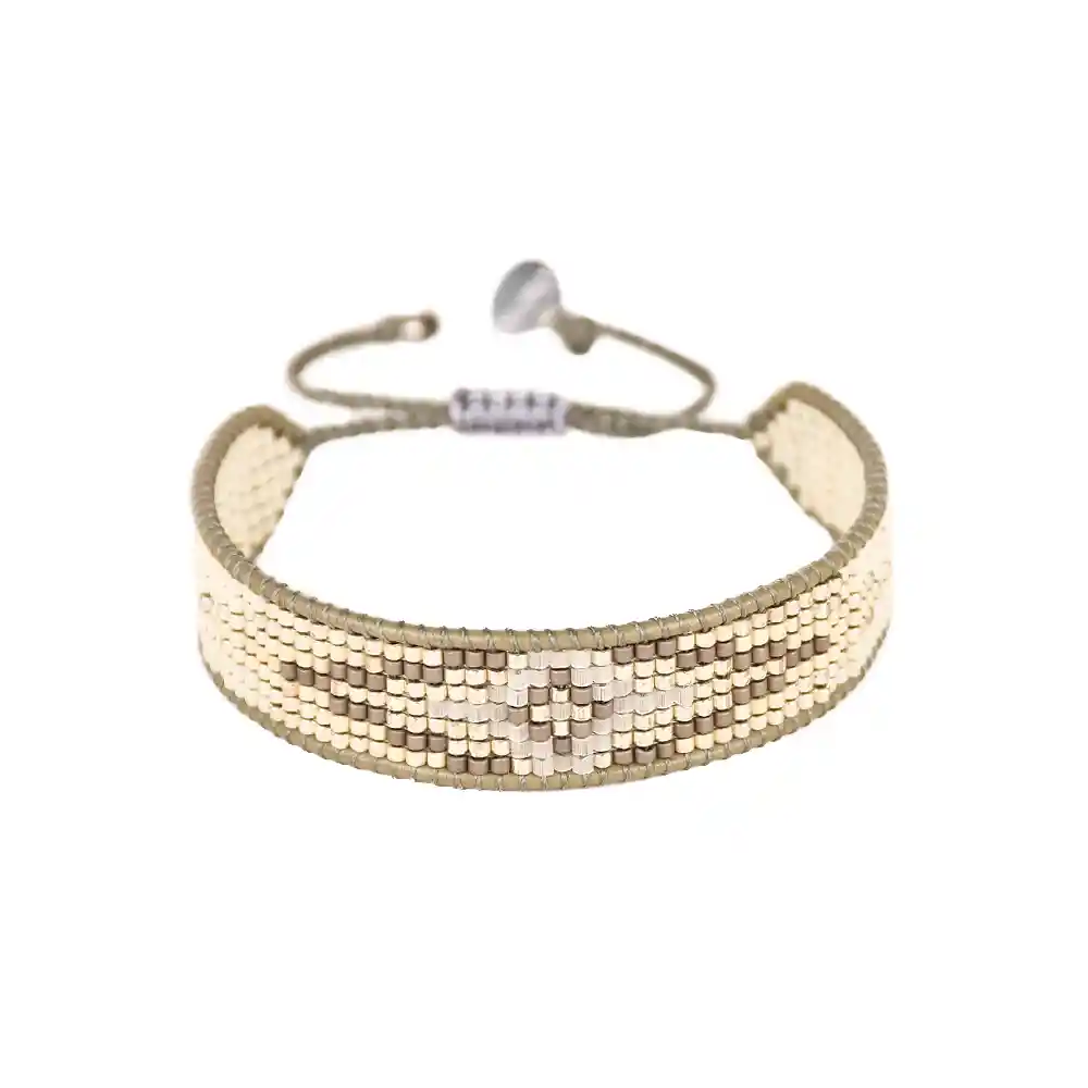 Pulsera artesanal elaborada con delicadas cuentas Miyuki, tejida con hilos resistentes. La combinación de tonos beige, cobre y plateado aporta sofisticación y versatilidad, ideal para cualquier ocasión. Colores: Beige, Copper & Silver Área tejida: ancho 0.6" (1.5 cm) Largo total: 5.1" (13 cm) Un accesorio elegante y único, perfecto para quienes buscan piezas con identidad artesanal y un toque contemporáneo.