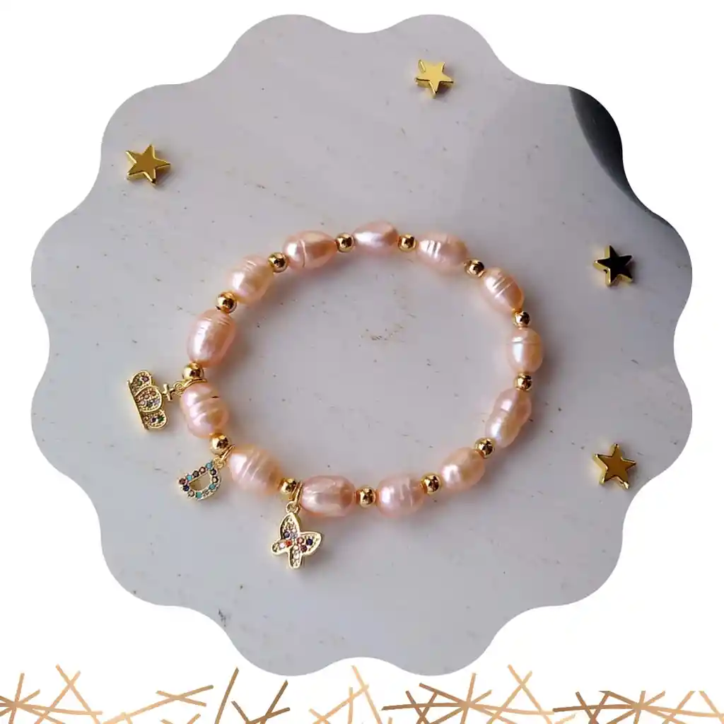 PULSERA DE PERLAS PEACH CULTIVADAS DE AGUA DULCE CON DIJES FINOS EN RODIO Y INICIAL DEL NOMBRE