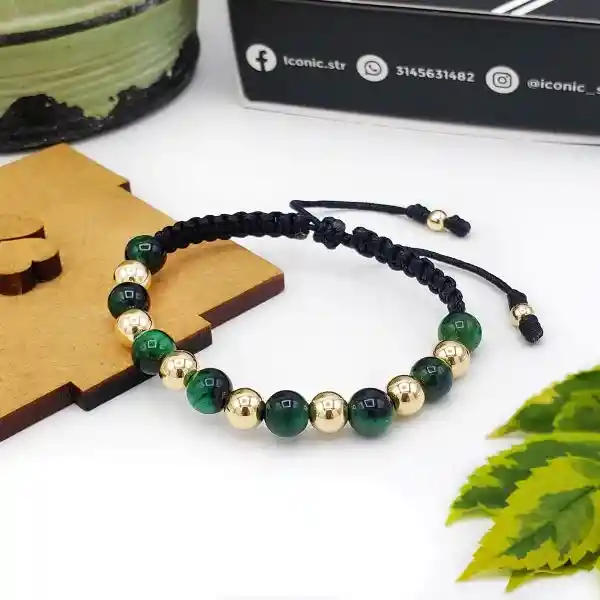 Pulsera elaborada con Cordón Italiano Negro, Piedra Ojo de Tigre Verde y Balines de Oro Laminado 18k de 6mm. Va empacada en Cajita para Obsequio. El Oro Laminado es una composición de Titanio con 3 Capas de Oro 18K al horno con Tecnología Italiana. Tiene el mismo tono y Brillo del Oro. Es resistente al agua, sudor y lociones. No se pela, no se negrea, no se decolora. El tono dorado tiene una durabilidad prolongada de aproximadamente 10 años. El producto está garantizado por 1 Año. - TALLAS DISPONIBLES - Son elaboradas a una medida estándar.