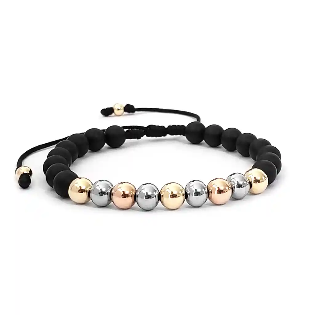Pulsera elaborada con Cordón Italiano, Piedra Ónix Mate, Balines de Acero Plateado 6mm, Oro Laminado Dorado y Rosado 18k. Va empacada en Cajita para Obsequio. ¿Qué es el Oro Laminado? El Oro Laminado está conformado por una base de titanio recubierta de manera experta con tres capas de oro de 18K que se someten a un proceso de horneado meticuloso, logrando así una apariencia y brillo indistinguibles del oro auténtico. Posee una extraordinaria resistencia al agua, al sudor y a las lociones, lo que garantiza que su tono dorado no se desvanezca con el paso del tiempo. El producto es respaldado por una garantía de 1 año. Tamaños disponibles: Disponible en 6 milímetros. Propiedades de la Piedra Ónix Mate: - Protección: En algunas culturas, el ónix se asocia comúnmente con la protección. Se cree que esta piedra puede ayudar a crear un escudo energético que protege contra energías negativas y malas influencias. - Fuerza y resistencia: El ónix se asocia con la fuerza y la resistencia física y mental. Se cree que proporciona energía y vigor, ayudando a superar obstáculos y desafíos. Signos Zodiacales Relacionados: Capricornio, Leo y Escorpio. Tallas disponibles: ESTANDAR