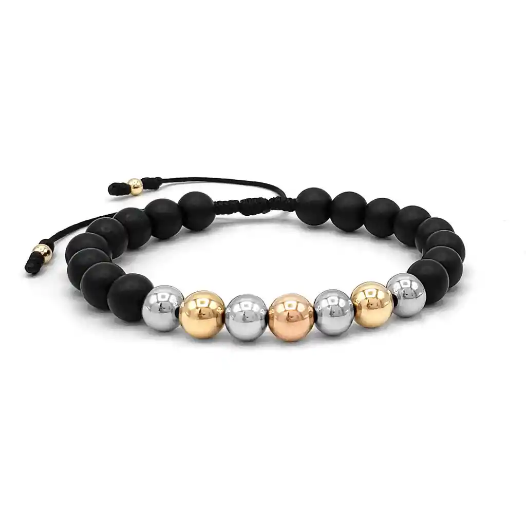 Pulsera elaborada con Cordón Italiano, Piedra Ónix Mate, Balines de Acero Plateado 6mm, Oro Laminado Dorado y Rosado 18k. Va empacada en Cajita para Obsequio. Disponible en 8 milímetros. Propiedades de la Piedra Ónix Mate: - Protección: En algunas culturas, el ónix se asocia comúnmente con la protección. Se cree que esta piedra puede ayudar a crear un escudo energético que protege contra energías negativas y malas influencias. - Fuerza y resistencia: El ónix se asocia con la fuerza y la resistencia física y mental. Se cree que proporciona energía y vigor, ayudando a superar obstáculos y desafíos. Signos Zodiacales Relacionados: Capricornio, Leo y Escorpio. ¿Qué es el Oro Laminado? El Oro Laminado está conformado por una base de titanio recubierta de manera experta con tres capas de Oro de 18k que se someten a un proceso de horneado meticuloso, logrando así una apariencia y brillo indistinguibles del oro auténtico. Posee una extraordinaria resistencia al agua, al sudor y a las lociones, lo que garantiza que su tono dorado no se desvanezca con el paso del tiempo. Garantía: El producto se encuentra respaldado por una garantía de 1 año. (No cubre raspaduras, ralladuras o abolladuras por mala manipulación). Tallas disponibles: ESTANDAR