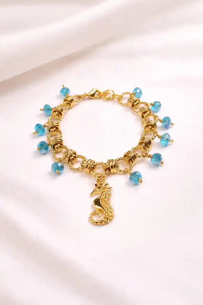 Pulsera elaborada artesanalmente con cadena en bronce con baño en oro, piedras murano azul y dije caballo de mar, diseñada para aportar un toque diferente al outfit transmitiendo significado y amor para inspirar y empoderar con garantía de 30 días en acabados bajo condiciones normales de uso y posibles variaciones en colores y acabados por su elaboración manual,.