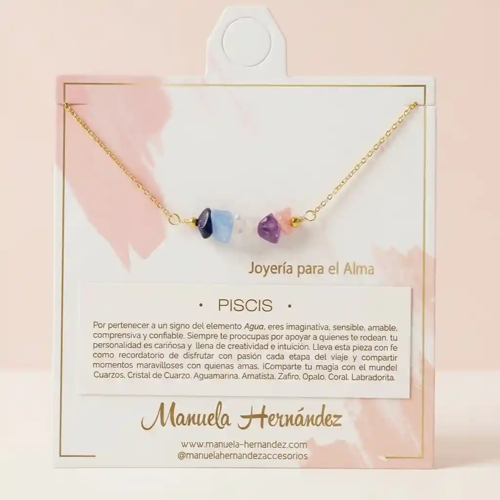 La cadena y los apliques dorados cuentan con Baño de Oro 18k. Elaborado con Cuarzos Naturales.