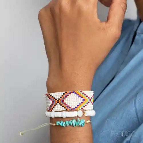 Pulsera hecha a mano y tejida con chaquiras checas imitando la técnica miyuki. Contiene complementos como murano en resina y piedra picada natural.
