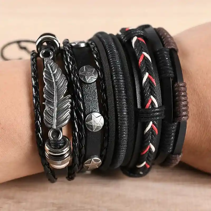 set de 5 pulseras en cuero con dije de hoja, para caballeros!!