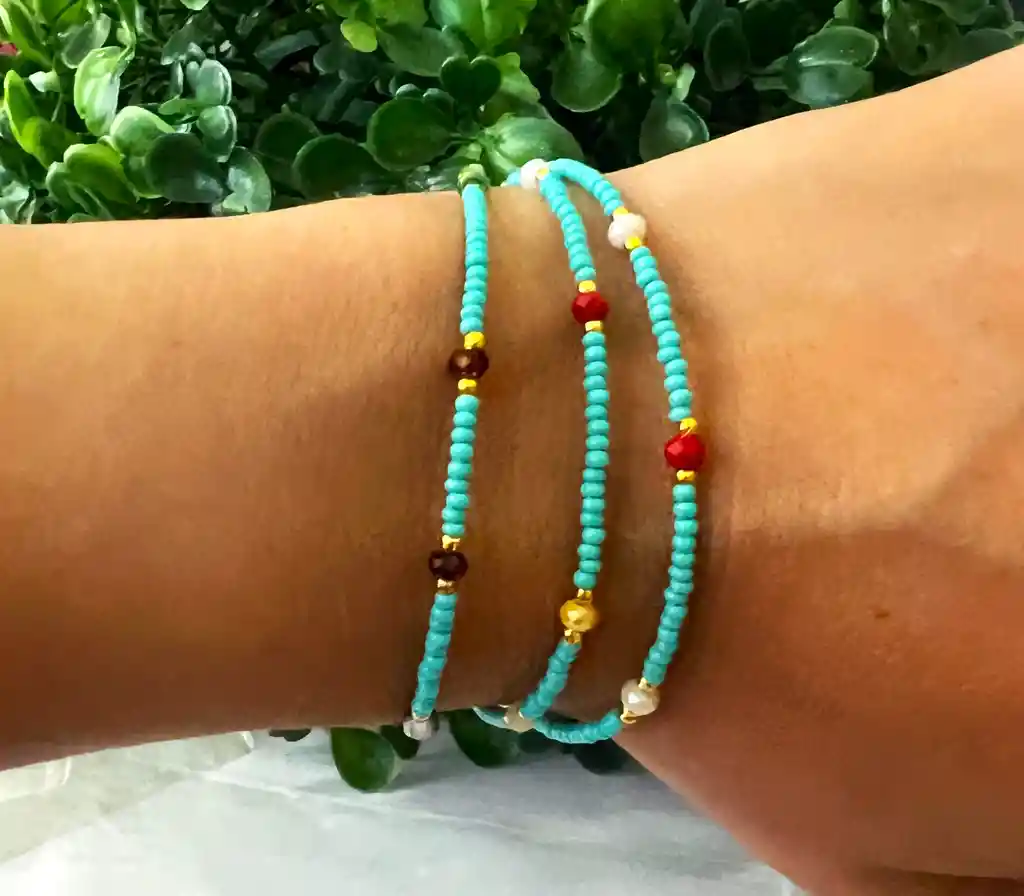 PULSERA TRIPLE TURQUESA CON PIEDRAS DE DIFERENTE COLOR