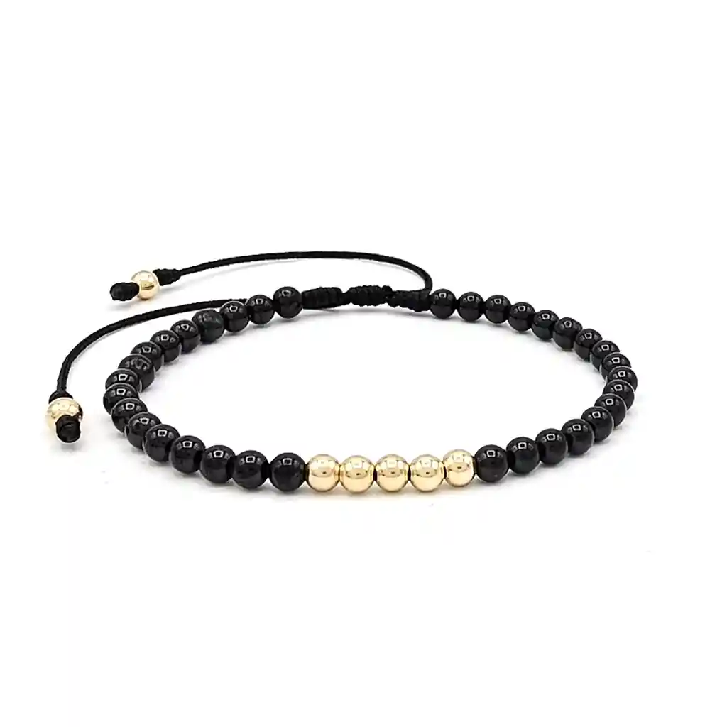 Pulsera elaborada con Cordón Italiano, Piedra Turmalina Negra 4mm y Balines de Oro Laminado 18k de 4mm. Va empacada en Cajita para Obsequio. Propiedades de la Turmalina Negra: La Turmalina Negra es considerada la piedra de protección por excelencia. Simboliza la limpieza, la purificación y la transformación de las energías densas en vibraciones ligeras. Actúa como un escudo contra la negatividad y las radiaciones, fomentando la autoconfianza y el equilibrio emocional para mantener al portador centrado. Signos zodiacales relacionados: Capricornio, Escorpio y Libra. ¿Qué es el Oro Laminado? El Oro Laminado está conformado por una base de titanio recubierta de manera experta con tres capas de Oro de 18k que se someten a un proceso de horneado meticuloso, logrando así una apariencia y brillo indistinguibles del oro auténtico. Posee una extraordinaria resistencia al agua, al sudor y a las lociones, lo que garantiza que su tono dorado no se desvanezca con el paso del tiempo. Garantía: El producto se encuentra respaldado por una garantía de 1 año. (No cubre raspaduras, ralladuras o abolladuras por mala manipulación). Tallas disponibles: Estándar