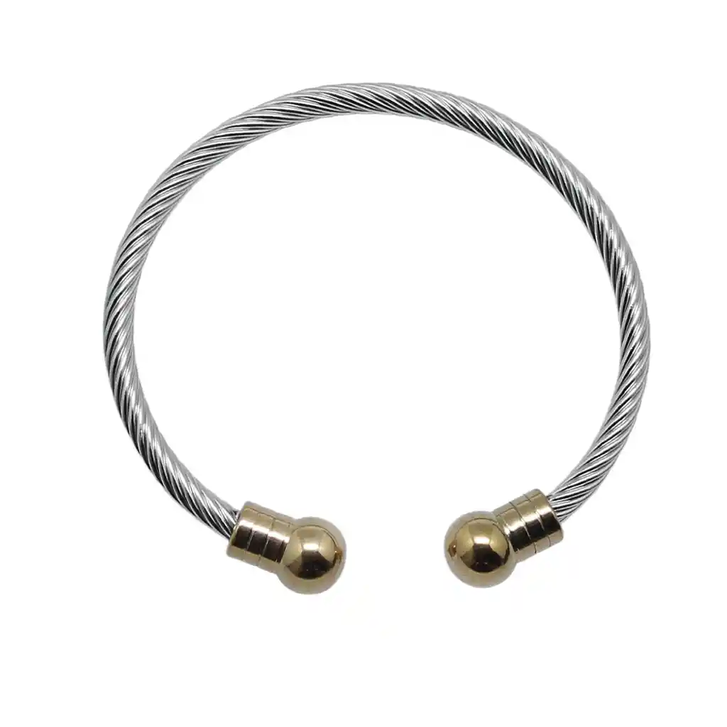 Lleva el concepto de minimalismo moderno al siguiente nivel con esta pulsera rígida que combina texturas clásicas con un contraste metálico audaz. Es la pieza perfecta para quienes buscan un accesorio con estructura, carácter y un toque de luz plateada.