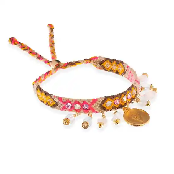 Pulsera 100% tejida a mano por la comunidad Wayuu en la Guajira con incrustación en cristal swarovski, dije en bronce con baño en oro, elaborado a mano en técnicas de orfebrería en nuestro taller y adición de mix de Cuarzos.