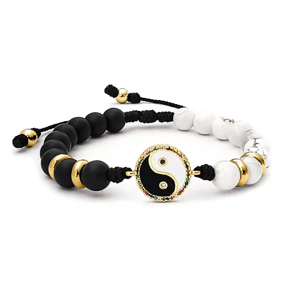 Pulsera elaborada con Cordón Terlenka, Acero Inoxidable, Yin Yang de Rodio, Piedras Howlita y Ónix Mate 8 milímetros. Materiales de Alta Calidad. Va empacada en Cajita para Obsequio. Disponible en color Dorado o Plateado. Elige tu favorita. ¿Qué simboliza la pulsera de Yin Yang? La pulsera con el yin yang simboliza el equilibrio entre los opuestos complementarios, como luz y oscuridad, representando armonía y conexión universal. Refleja la aceptación de la dualidad en la vida y la búsqueda de paz interior. También puede asociarse con protección y energía positiva. Para quien la usa, es un recordatorio de fluir con los cambios naturales de la existencia. Propiedades de la piedra ónix: El ónix es una piedra poderosa conocida por su capacidad de protección, absorbiendo y transformando las energías negativas. Proporciona fortaleza interior, ayudando a mantener el equilibrio emocional en momentos difíciles. Además, es ideal para superar miedos, reducir el estrés y aumentar la determinación, favoreciendo la estabilidad mental y física. Propiedades de la piedra howlita: La howlita es una piedra calmante que promueve la relajación y la serenidad, ideal para momentos de ansiedad o inquietud. Favorece la paciencia y la claridad mental, ayudando a expresar las emociones con mayor tranquilidad. Su energía suave también contribuye a conciliar el sueño y a liberar tensiones acumuladas. Signos zodiacales relacionados: Ónix: Capricornio, Escorpio, Leo. Howlita: Géminis, Sagitario, Piscis. Tallas disponibles: ESTANDAR