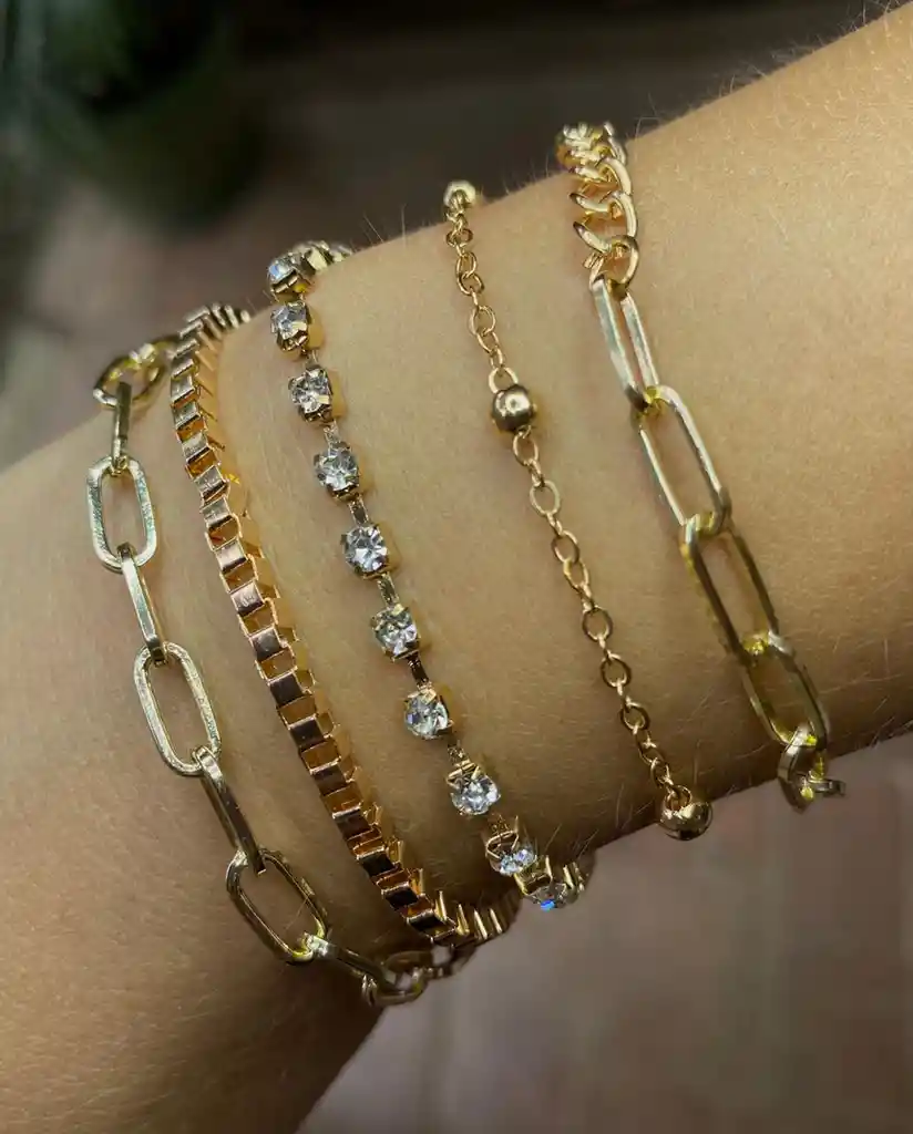 5 hermosas pulseras en diferentes estilos de cadenas. material fantasía