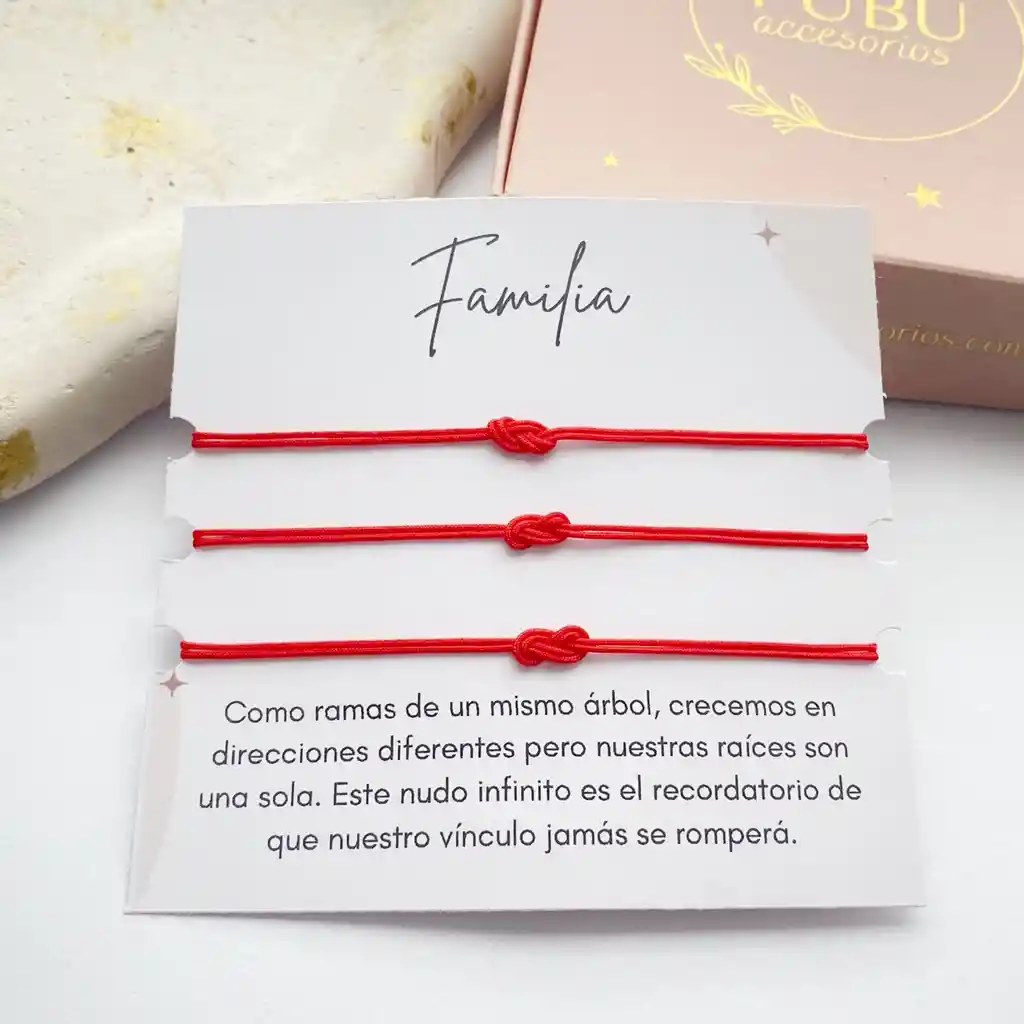 PF1 Set x3 Pulseras "Vínculo Familiar" ❤️ El regalo perfecto, listo para entregar en minutos. 🎁 Set de 3 pulseras de hilo rojo con el Nudo Infinito, símbolo de amor eterno y protección. Ideal para compartir entre madre, hijos o hermanos. ¿Qué incluye? • 3 Pulseras ajustables: Hilo de alta resistencia, talla única para niños y adultos. • Tarjeta con mensaje: "Nuestras raíces son una sola". Un detalle que emociona. • Empaque de regalo: Se envía en su caja exclusiva de Pubu Accesorios, ¡lista para sorprender! ✨ Un detalle con alma para quienes siempre están unidos.