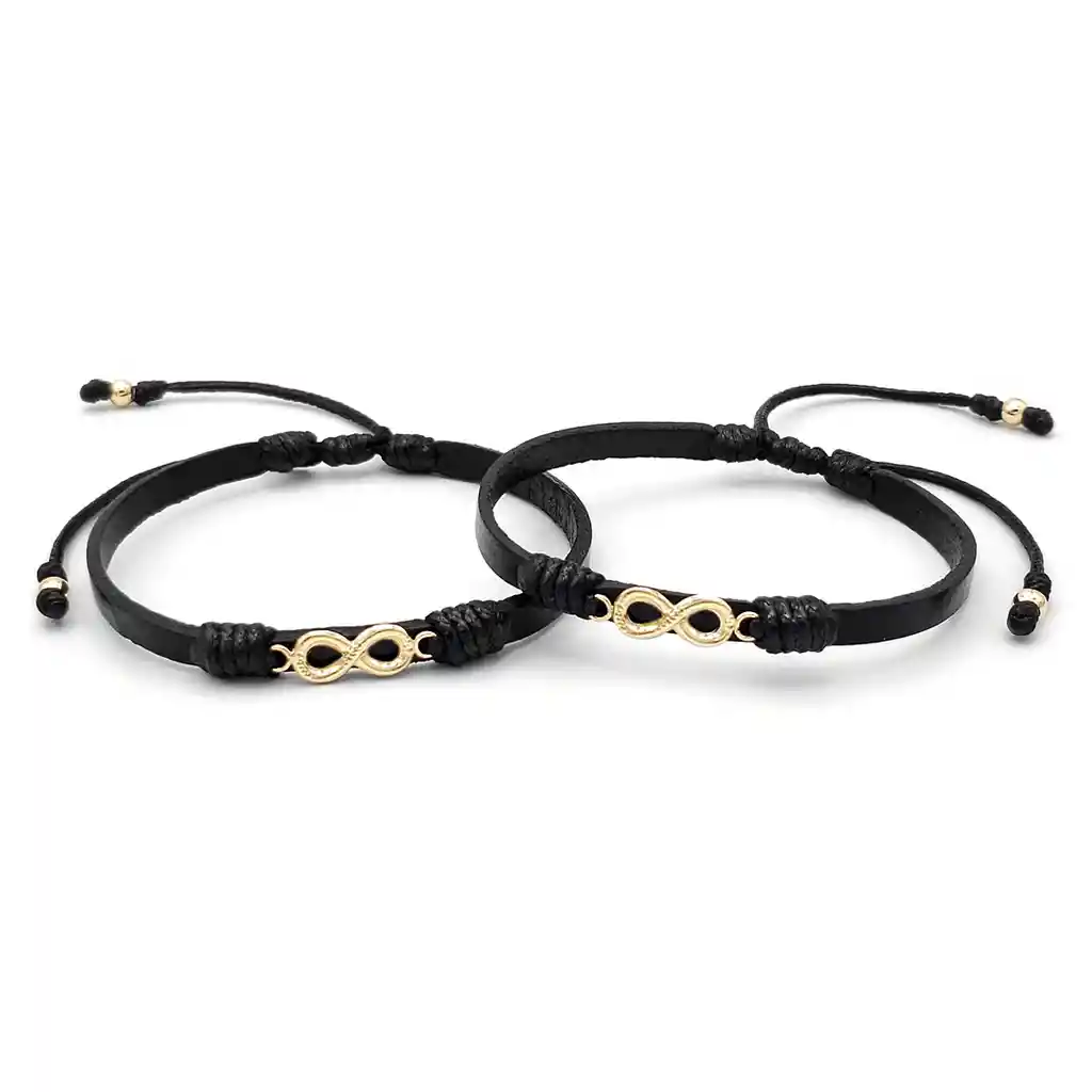 Pulseras elaboradas con Cordón Víbora, Cuero Natural Plano de 5 milímetros, Dijes de Infinito de Oro Laminado y Balines Colgantes de Oro Laminado 18k de 4mm. Van empacadas en Cajita para Obsequio. ¿Qué simbolizan las pulseras de infinito? Las pulseras de infinito para parejas o amigos simbolizan una conexión eterna y sin fin entre dos personas que comparten un vínculo especial y duradero. ¿Qué es el Oro Laminado? El Oro Laminado está conformado por una base de titanio recubierta de manera experta con tres capas de Oro de 18k que se someten a un proceso de horneado meticuloso, logrando así una apariencia y brillo indistinguibles del oro auténtico. Posee una extraordinaria resistencia al agua, al sudor y a las lociones, lo que garantiza que su tono dorado no se desvanezca con el paso del tiempo. Garantía: El producto se encuentra respaldado por una garantía de 1 año. (No cubre raspaduras, ralladuras o abolladuras por mala manipulación). Tallas disponibles: ESTANDAR