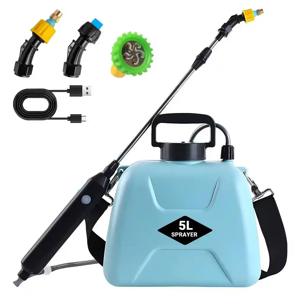 Este pulverizador eléctrico de 5 litros es la solución ideal para quienes buscan eficiencia y comodidad en el cuidado del jardín o tareas de desinfección, eliminando la necesidad de bombeo manual gracias a su sistema automático de un solo botón. Equipado con una batería de litio de 1500mAh recargable mediante USB, ofrece una autonomía prolongada y un flujo constante de pulverización a través de su varilla telescópica ajustable de hasta 65 cm. Su diseño ergonómico incluye una correa de hombro ajustable para facilitar el transporte y tres boquillas intercambiables que permiten alternar entre una atomización fina, un chorro potente de largo alcance o una pulverización en abanico, adaptándose con precisión a cada necesidad de riego o limpieza. Ficha Técnica: Tipo de producto: Pulverizador eléctrico portátil Capacidad del tanque: 5 Litros (1.35 Galones) Voltaje de funcionamiento: 3.7 V Capacidad de la batería: 1500 mAh Método de carga: Cable USB (incluido) Material del tanque: Polietileno de alta densidad (HDPE) Largo de la varilla telescópica: Ajustable hasta 65 cm Ancho del tanque: 26 cm Alto del tanque: 29 cm Modos de pulverización: Atomización fina, chorro directo y abanico Accesorios incluidos: 3 boquillas, correa de hombro, cable de carga y manguera flexible Tipo de encendido: Botón táctil de un solo toque en el mango Términos de Garantía: Para defectos de fábrica o retractos: Por favor revise el producto apenas lo reciba y antes de usarlo. No aplican ley de retracto o defectos de fábrica luego de usar el producto. Se manejan máximo 5 días para reportar defectos de fábrica (por ejemplo, producto funciona mal, piezas faltantes, rotas, etc). Para hacer efectiva la devolución el producto debe devolverse con el empaque original, el cual debe estar en buen estado, incluir todos los documentos y las partes completas y sin daños.