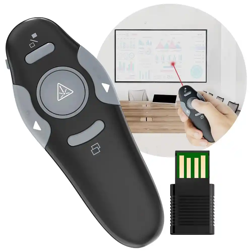 Este apuntador láser innovador diseñado para controlar diapositivas con facilidad y precisión. Con su tecnología láser avanzada, puedes destacar información importante y mantener a tu audiencia enfocada. El dispositivo también permite avanzar y retroceder en tus presentaciones con solo pulsar un botón, haciendo que tus reuniones y conferencias sean más fluidas y profesionales. Además, su diseño ergonómico y ligero te permite manejarlo con comodidad durante largos períodos de tiempo. Sin complicaciones, simplemente conéctalo al puerto USB de tu ordenador El receptor USB es plug and play-no se requiere controlador Ahorro de Energía, ligero, adecuado para colocar en el bolsillo o los bolsos Este puntero láser de alta calidad adopta la última tecnología óptica láser rojo y microelectrónica Cuenta con botones intuitivos para distintas funciones: - Interruptor lateral para encendido y apagado junto con botón para conectar. - Cambiar entre páginas con fluidez, para avanzar o retroceder en tu presentación sin esfuerzo. - Activar el láser con un solo toque, para destacar y dirigir la atención de tu audiencia hacia detalles específicos. - Cambiar a pantalla completa con un solo clic, garantizando que tu contenido se vea con claridad y sin distracciones. - Cambiar a una pantalla negra instantáneamente, ya sea para enfocar la atención en ti mientras hablas o para terminar tu presentación. Especificaciones: Frecuencia: 2.4GHz Compatible con MS Word, excel, PowerPoint, ACD See, website etc, con función de arriba y abajo de página Presentaciones de hasta 7 metros de distancia Fuente de alimentación: 1 pila AAA (incluida)