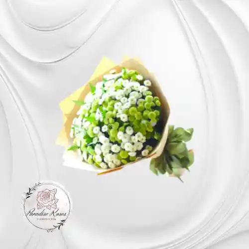 Hermoso ramo de pinoquios blancas combinadas con verdes. Refleja pureza, sencillez y ternura, perfecto para un detalle dulce, nacimientos, bautizos y amistad.