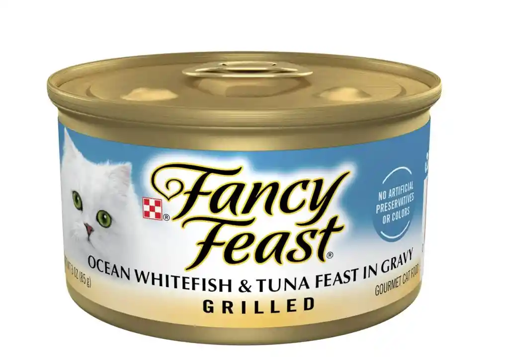 Detalles del producto Purina Fancy Feast Comida húmeda para gatos Atún de pescado blanco del océano, Regala a tu gato una aventura junto al mar cuando le sirvas Purina Fancy Feast a la parrilla Atún de pescado blanco del océano en comida gravy para gatos. Tu gato no es solo un amigo peludo, sino un verdadero miembro de tu familia, así que dale una comida que no pueda resistir al proporcionarle un plato principal que presenta una salsa rica y suculenta combinada con deliciosas piezas de pescado blanco y atún a la perfección. Pasa menos tiempo preocupándote por encontrar una opción de comida de calidad para tu gato y más tiempo atesorando tus momentos invaluables juntos. Purina Fancy Feast Comida húmeda para gatos Atún de pescado blanco del océano, latas de 3 oz (24 unidades) Sabor clásico a mariscos con una mezcla de pescado blanco y atún Características Nutrición completa y equilibrada al 100% para gatos sanos Una salsa rica en salsa realza la comida Ingredientes de origen responsable para un menor impacto en el medio ambiente Latas totalmente reciclables hacen que ayudar a la tierra sea más fácil que nunca Desecha a tu mascota con productos Purina. Recompénsate con puntos en cada compra. Instrucciones Alimentar a un gato adulto de tamaño promedio con 1 lata por cada 1.4 kg de peso corporal al día. Para gatitos, ofrecer hasta el doble de esta cantidad. Las gatas gestantes o en periodo de lactancia pueden requerir entre 2 y 4 veces su ración habitual. Instrucciones de alimentación Alimentar a un gato adulto de tamaño promedio con 1 lata por cada 1.4 kg de peso corporal al día. Para gatitos, ofrecer hasta el doble de esta cantidad. Las gatas gestantes o en periodo de lactancia pueden requerir entre 2 y 4 veces su ración habitual. Ingredientes activos Caldo de pescado, subproductos cárnicos, gluten de trigo, pescado blanco del océano, atún, pollo, almidón de maíz modificado, harina de soya, aceite de maíz, glicina, sal, fosfato tricálcico, sabor natural, minerales [cloruro de potasio, proteinato de magnesio, sulfato de zinc, sulfato ferroso, sulfato de manganeso, sulfato de cobre, yoduro de potasio], taurina, cloruro de colina, vitaminas [mononitrato de tiamina, suplemento de vitamina E, niacina, pantotenato de calcio, suplemento de vitamina A, complejo de bisulfito sódico de menadiona, clorhidrato de piridoxina, suplemento de riboflavina, suplemento de vitamina B12, biotina, ácido fólico, suplemento de vitamina D3].