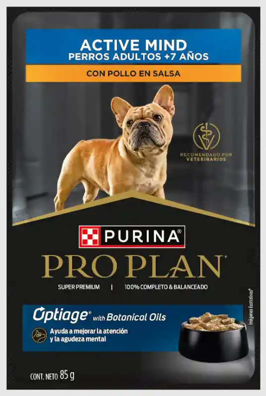 Alimento húmedo formulado con Optiage y aceites botánicos para ayudar a mejorar la atención y la agudeza mental en perros senior (+7 años) de todos los tamaños y razas. Producto con fecha de vencimiento vigente.