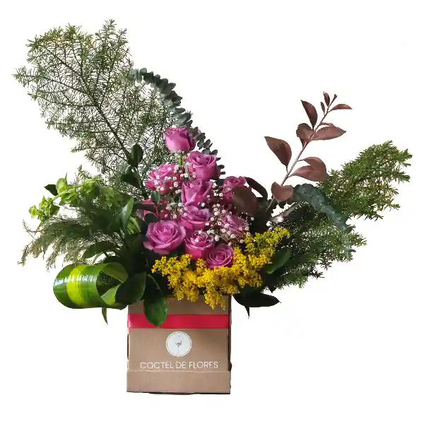 Diseño floral con 12 rosas lilas o rosadas y follaje en caja de cartón.