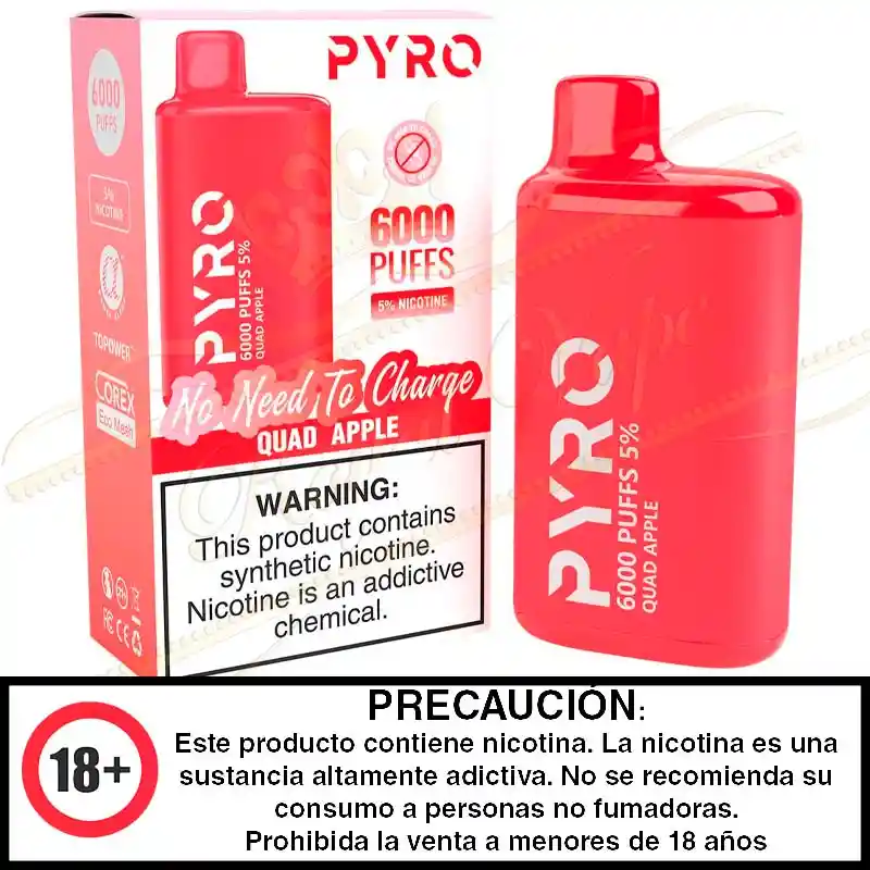 Dispositivo de vapeo desechable 6.000 caladas Concentración de nicotina: 5% - 50mg por ml Sabor: Frambuesa roja, sandia mentolada Ingredientes: Glicerina vegetal, Propilenglicol, nicotina y saborizantes artificiales El número de caladas puede variar de acuerdo a los hábitos de vapeo del usuario, entre más largas y profundas las inhalaciones menos cantidad de caladas dura Material: Plástico Concentración de nicotina: 50mg/ml 5% Batería: 800 mAh No recargable Liquido precargado: 13ml Contenido: 1 dispositivo desechable ADVERTENCIA Este producto contiene nicotina, una sustancia muy adictiva. No debe ser usado por mujeres embarazadas o personas con problemas respiratorios, no se recomienda su uso a no fumadores, mantener fuera del alcance de niños y mascotas, en caso de accidente consulte a su médico. Recuerda si no fumas no vepees, ESTE PRODUCTO PUEDE SER PELIGROSO Y PERJUDICIAL PARA LA SALUD. Vapear no es un juego ni una moda. Prohibida su venta a menores de edad.