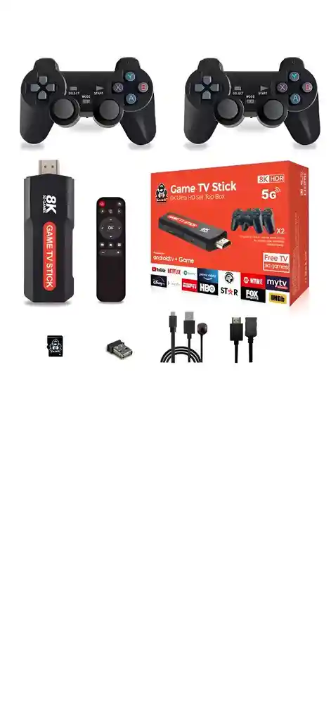 Transforma tu televisor en una consola de videojuegos y Smart TV con este potente Game TV Stick 8K HDR con Android TV + Game Edition. Disfruta de miles de juegos retro y plataformas de streaming como YouTube, Netflix, Prime Video, y mucho más, todo desde un solo dispositivo. Características destacadas: * Resolución Ultra HD 8K HDR para una experiencia visual de última generación * Sistema Android TV integrado: accede a aplicaciones, juegos y contenido online * Incluye más de 30.000 juegos retro clásicos * 2 controles inalámbricos estilo consola incluidos para jugar en modo multijugado
