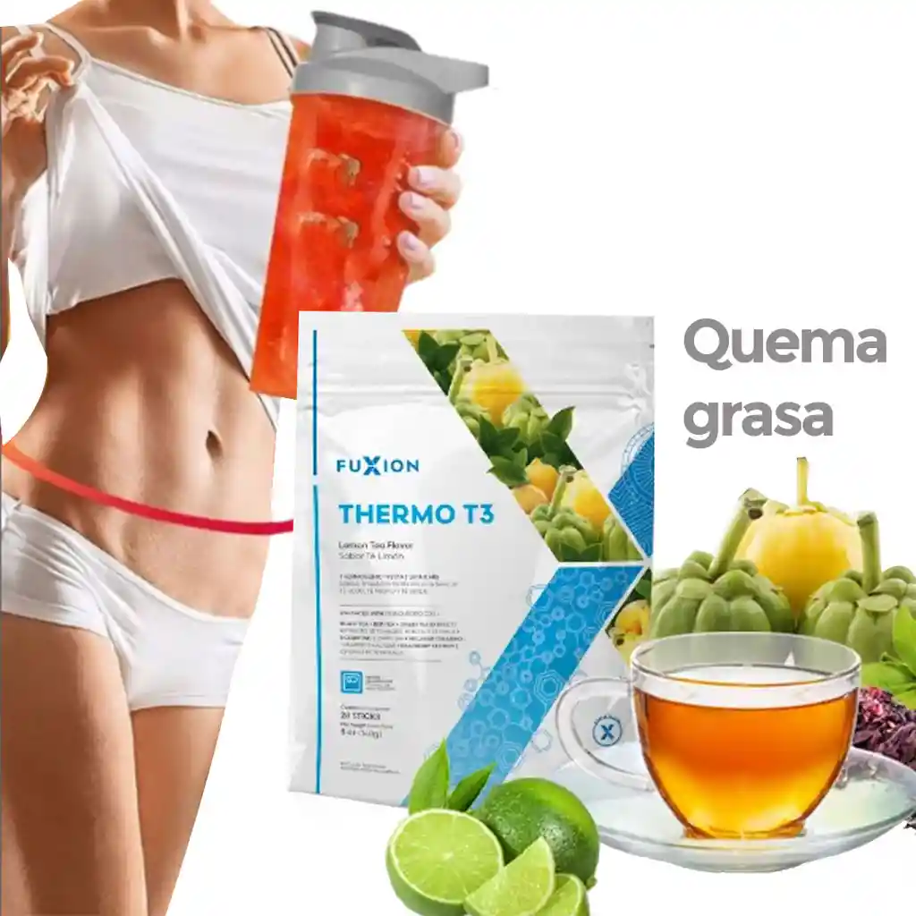 Thermo T3 de FuXion es una bebida funcional en polvo con sabor a té limón, diseñada para apoyar la pérdida de peso de manera natural y saludable. Su fórmula combina extractos de té y otros ingredientes que promueven la quema de grasa y el aumento de energía. Preparación Disolver el contenido de un stick en una taza con 200 ml de agua caliente. Recomendación de Consumo Uno o dos sticks al día, después de las comidas. Si haces ejercicio, tómalo antes de entrenar.