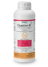 Quetion K presentado como solución líquida altamente concentrada. Su empleado previene y corrige estados caren- ciales de potasio en los cultivos. Es un formulado que combina dos nutrientes esenciales, potasio y azufre, en formas totalmente asimilables para la planta, exento de nitrógeno y cloruros. Su pH neutro (7,08) nos permite su aplicación y asimilación sin los problemas que puedan surgir con las potasas tradi- cionales. Indicado para agricultura intensiva (bajo invernadero), cultivos intensivos y periodo corto, a campo abierto.