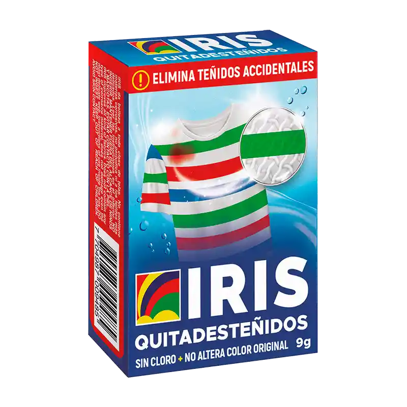 Saludos Comunidad, A la venta este QUITADESTEÑIDOS/MANCHAS, con las siguientes caracteristicas: ELIMINA TEÑIDOS ACCIDENTALES SIN CLORO + NO ALTERA COLOR ORIGINAL QUITADESTEÑIDOS IRIS, producto innovador para quitar todo tipo de manchas accidentales de color en la ropa y demás textiles, sean blancos o de color, como cuando una prenda sin que se desee mancha otra, sea durante el proceso de lavado o durante su uso. QUITADESTEÑIDOS IRIS actúa sobre el color que se desea quitar, no sobre la prenda. También puede ser usado para rebajar o igualar el color de un textil. QUITADESTEÑIDOS IRIS no contiene cloro ni ningún otro agente que perjudique las fibras textiles, por delicadas que estas sean, puede usarse en estufa y balde. Producto ideal para reparar las manchas accidentales de color en la ropa y demás textiles sin perjudicar los colores originales. ¿CUÁNTA MANCHA QUITA? Una cajetilla de QUITADESTEÑIDOS IRIS contiene un sobre de 9 gramos de producto y depende del tamaño de la(s) mancha(s) a tratar, pues actúa sobre ellas, no sobre el peso de la prenda. Para una camisa blanca de hombre talla M manchada toda con una media roja, es suficiente usar 9 gramos de QUITADESTEÑIDOS IRIS. Tener presente que: para prendas totalmente blancas se puede aplicar todo el contenido del sobre de 9 gramos. Para prendas blancas con otros colores y prendas de colores, se recomienda inicialmente pequeñas cantidades para no modificar el tono de los colores existentes. ¿PARA QUÉ SIRVE? Quita las manchas de colores accidentales en las telas. Si son telas blancas aplique la cantidad de producto que desee, si son de colores o estampadas, aplique inicialmente una pequeña cantidad. (*) Puede rebajar el color original de la prenda si se excede en producto. Hay manchas de color que no se quitan de ninguna forma porque no son colorantes, son pigmentos, tales como pinturas vinílicas, tintas, estampados y similares. Si son colorantes que no salen por su alta capacidad de tintura, QUITADESTEÑIDOS IRIS los rebaja, de esta manera pueden teñirse las prendas para enmascarar las manchas. Para recuperar el blanco perdido en las telas. Seguro para todo tipo de telas que se puedan lavar en agua caliente. NO USAR EN PRENDAS DE LAVADO EN SECO. No contiene cloro, no deteriora las fibras textiles. Generalmente NO altera el color original de las prendas (*). **COMPRE CON SEGURIDAD Y CONFIANZA** Somos Su Inversión, empresa legalmente constituida, 15 años de experiencia en ventas On-Line. **PARA PAGAR*: MERCADO PAGO (PSE, EFECTY, TARJETA DE CRÉDITO) **PARA ENVIAR o ENTREGAR PRODUCTO*: SAFERBO, ENVIA, SERVIENTREGA, INTERRAPIDISIMO, o RECOGER PERSONALMENTE PREVIO PAGO (CERCA A ESTACIÓN DE POLICÍA DE SAN FERNANDO).