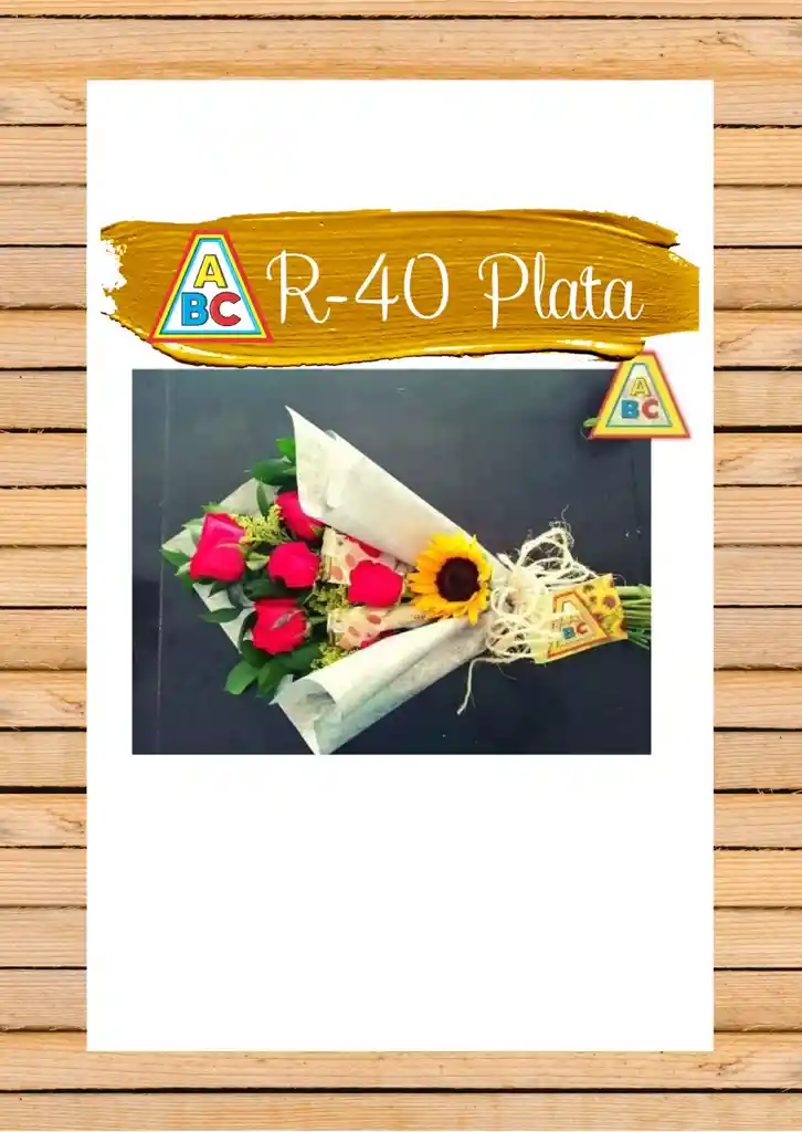 REGALO ELABORADO CON 7 ROSAS ROJAS, 1 GIRASOL, FOLLAJE, 2 BARRAS DE CHOCOLATES, ENVOLTURA Y LAZO DECORATIVO