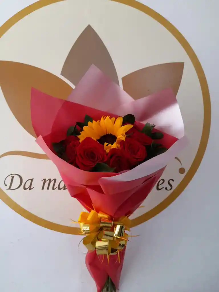 Ramillete redondo con 12 rosas rojas, 1 girasol, rusgo, papel coreano y moño.