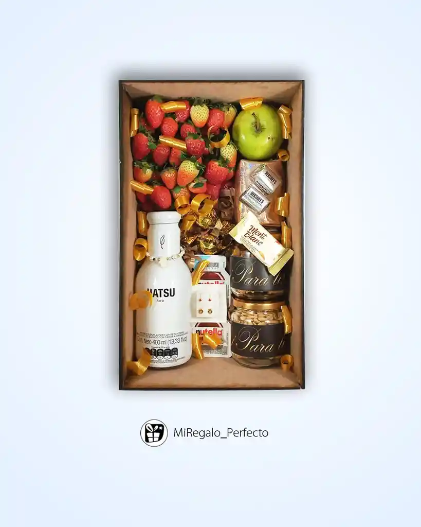 Regalo en cofre de madera, con fresas, 1 manzana, 2 Nutella mini, 2 botellita de cristal con frutos secos cada uno. Pulsera, monedero, te hatsu, 2 chocolates burbujas, 2 chocolates hersey Montblanc. Te incluye su decoración a temática, base, cintas, moños, adhesivos y tarjeta personalizada."