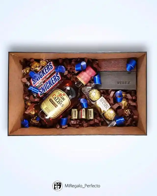 Regalo En Cofre De Madera Con Media De Ron Caldas, Billetera En Cuero De Vélez, Ferrero Rocher X3U, Snikers X2U, Copas De Shot X2U Y Burbujas X2. Te Incluye Toda Su Decoración A Temática, Con Base, Cintas, Moños, Tarjeta Personalizada. . .. .