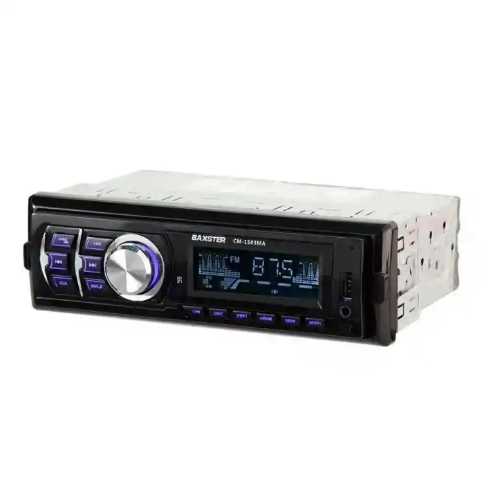 Radio para carro bluetooth usb auxiliar brax&stern cm-1503ma Radio auto 1 din cm1503ma Conexión bluetooth que te permite compartir tu música que más te gusta y gestionar tus llamadas. Radio fm 18 estaciones Playback mp3 Usb frontal Ranura sd Bluetooth Aux input Rca 4 vías 4 x 50w Incluye control remoto Pantalla LCD super grande con frecuencia y reloj Panel desmontable Conector iso Incluye cables de instalacion