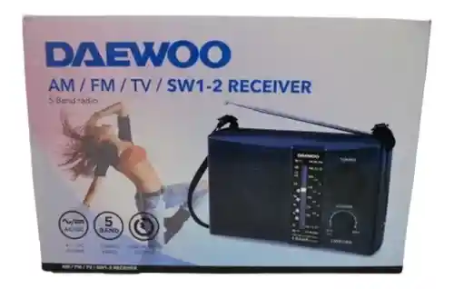 Radio Portátil AM/FM / SW1 - 2 DAEWOO Descripción: - Radio de 4 bandas - Alta potencia de salida - Alta sensibilidad - Antena 360 ° - Entrada para audífonos - Alimentación AC / DC - AC: 110V /220V ~ 60 Hz / 50Hz - DC: 3V ( um-1 X2) * Baterías NO incluidas - Medidas Aprox: 21,5 cm x 12,5 cm x 5,5 cm ( Largo x Altura X Ancho) - Peso: 1 Kg aprox. Especificaciones de Frecuencia: * FM: 88 -108 MHz * AM: 530 - 16OO KHz * SW1-2: 2.6 - 21.5 MHz
