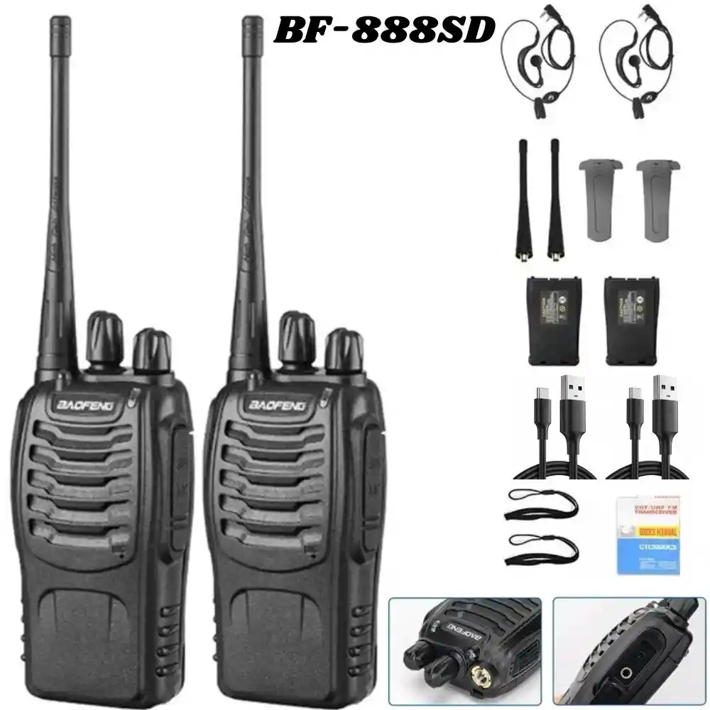 Radio De Comunicacion Walkie Talkie X2 Baofeng Bf-888SD Recargable El Baofeng Bf-888SD es un walkie talkie de alto rendimiento diseñado para ofrecer una comunicación clara y confiable en cualquier entorno. Con un diseño robusto y fácil de usar, este radio es ideal para uso profesional, actividades al aire libre, seguridad, logística, eventos y más. Especificaciones: - Frecuencia: 400 MHz - 480 MHz (Solo recepción de radio FM comercial) - Voltaje de funcionamiento: 3.7 V - Capacidad de la batería: 1500 mAh Li-ion - Estabilidad de frecuencia: ± 2.5 ppm - Temperatura de trabajo: -20°C / +55°C - Resistencia de la antena: 50 Ω - Rango de uso: 3 km - 5 km (APROX) - Sensibilidad: =0.20 µV PAQUETE INCLUYE: 2 * Walkie talkie Bf-888SD 2 * Batería recargable. 2 * Antena. 2 * Audífonos. 2 * Cable De Carga Tipo C 2 * Clip posterior. 1 * Manual