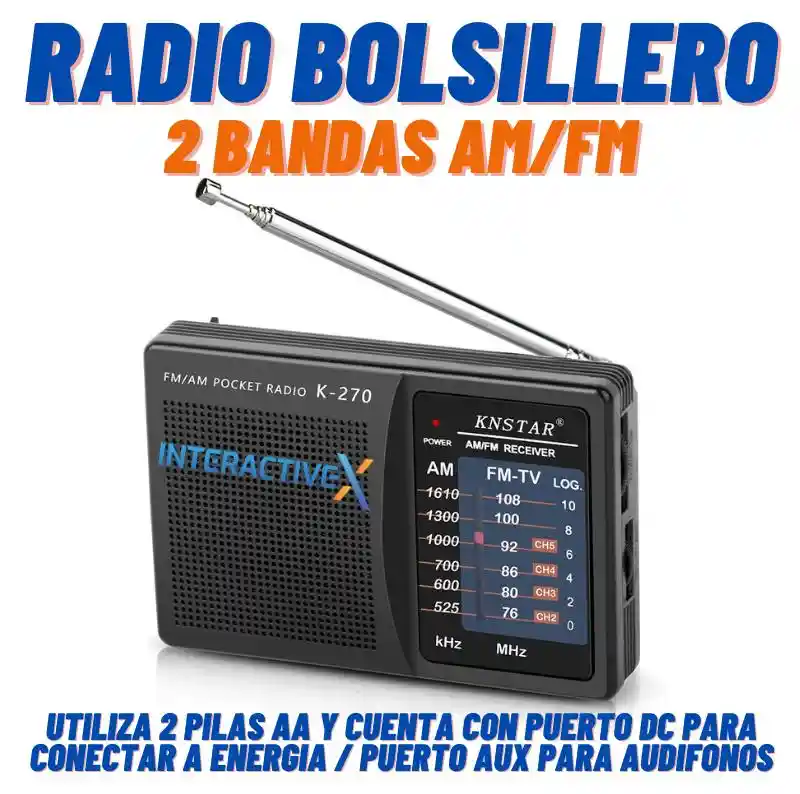RADIO PORTÁTIL AM FM K-270 KNSTAR BOLSILLO AUDIFONO RECEPTOR Radio de bolsillo, sintoniza frecuencias en la banda de AM y también de FM. Radio para llevar a todos lados, fincas, trabajo, estadio, etc. Alimentación con solo dos pilas AA, tiene salida para audífonos, fácil de operar, cordón para agarre. ESPECIFICACIONES TECNICAS: Sintonización Am y Fm Alimentación: 2 Pilas AA (no incluidas) Antena retráctil Salida para audífonos (no incluidos) Ancho: 11.5cm Alto: 7.5cm Profundo: 2cm Referencia de producto: K-270 RADIO